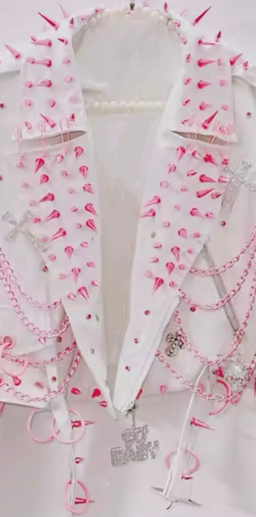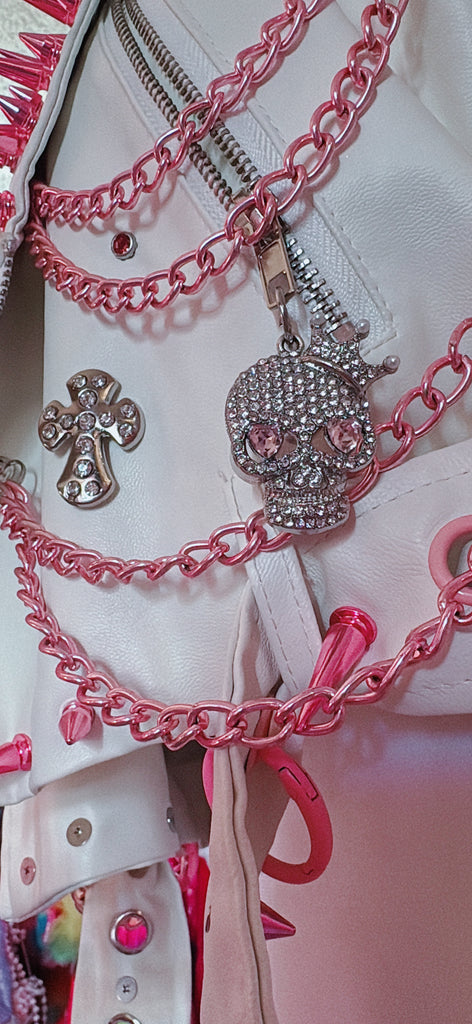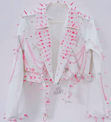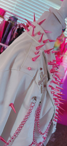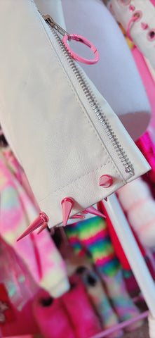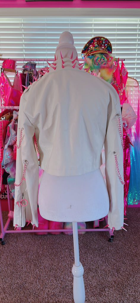Rock put in this Handmade Pink & White Spiked and Chained Vegan Leather Jacket!