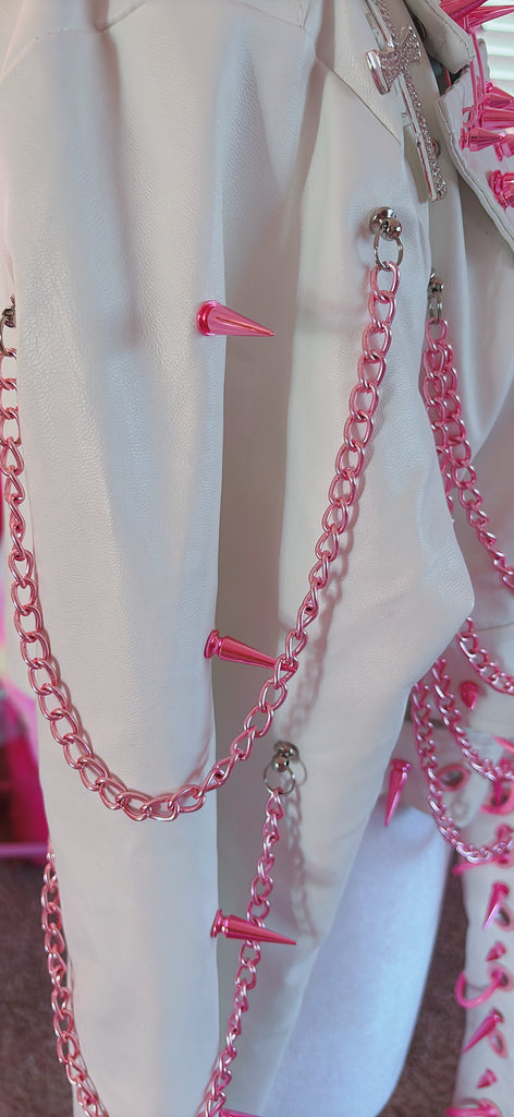 This includes Pink sharp spikes (long and short) on the collar, lapels, shoulders @ covering the bottom sleeves and upper back! - Pink Chome Chains on the Sleeves & Front sides of Jacket