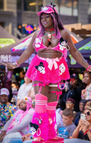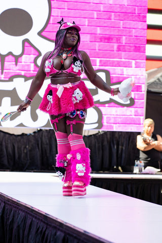 Good meets evil in this custom Hot Pink Hello-Kitty Faux Fur 2 Bra , Skirt & Boot Cover Set!
