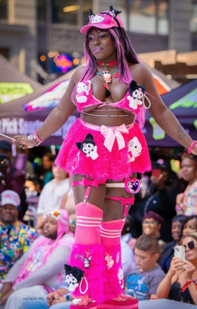 Matching Boot Covers are also customized with a Hot Pink “Drop Dead” Patch, Kuromi Keychain & Kuromi Character on one leg with a customized Graffiti Pink Mobey patch w/ Crown on top, Hello-Kitty Keychain & Hello-Kitty Plushie on the other leg.