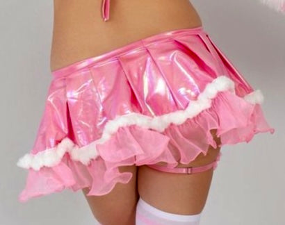Rock put in this Pink Iridescent Skirt trimmed with Faux Fur White Pom Poms & Pink Ruffles in the back!